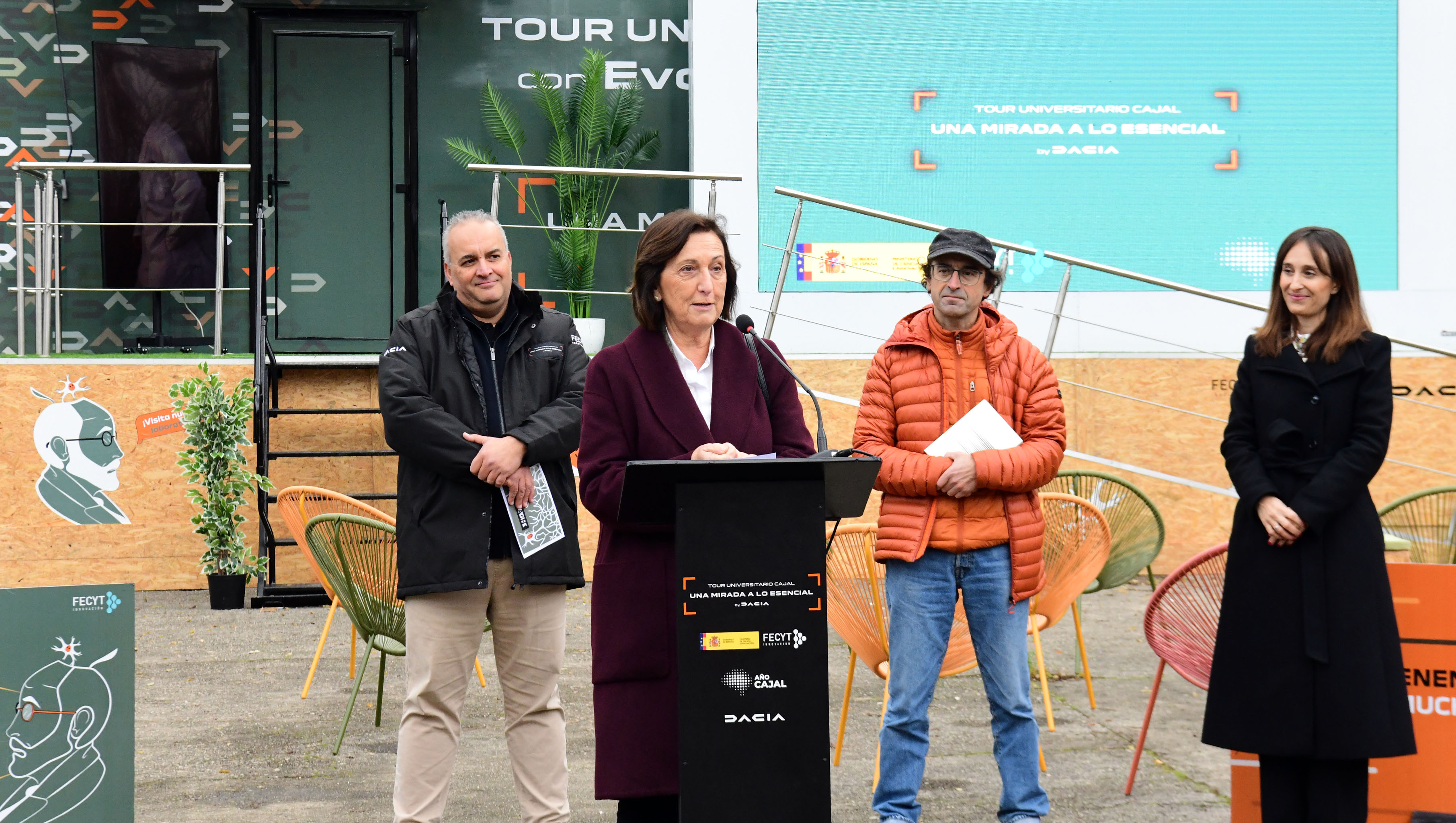 O ‘Tour Universitario Cajal. Unha mirada ao esencial’ ofrece no Campus Sur desde hoxe unha mostra en homenaxe ao Nobel Santiago Ramón y Cajal que se poderá ver ata o vindeiro venres na praza Rodríguez Cadarso. A vicerreitora de Política Científica da USC, Pilar Bermejo, interveu este martes 21 na rolda de prensa de presentación, e canda ela estiveron na rolda de prensa o terceiro tenente de alcaldesa do Concello de Santiago, Xesús Manuel Domínguez Domínguez; a directora de marketing da firma patrocinadora da mostra, Dacia España, Alaitz Garin; e o director do Tour Universitario Cajal, Jesús Ramos.