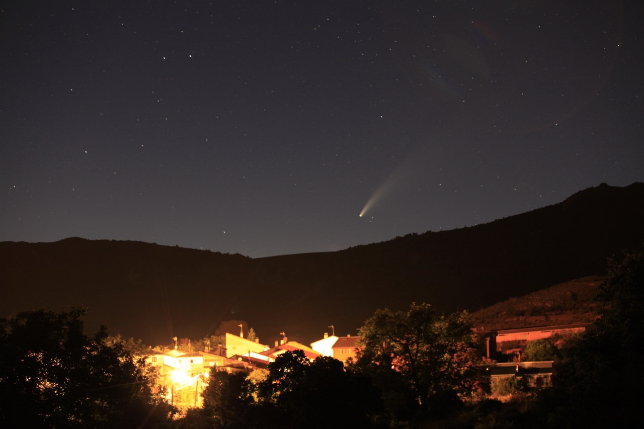 O cometa Neowise que foi descuberto a finais do pasado marzo e fíxose visible a primeira ollada nos amenceres dos primeiros días de verán, pode verse agora nas primeiras horas da noite, unha vez que xa pasou polo punto de mínima distancia ao Sol (perihelio). “A mellor referencia para localizalo é o Carro da Osa Maior. Á súa esquerda e máis abaixo, sempre en dirección noroeste, localízase facilmente con prismáticos, loxicamente desde lugares sen contaminación lumínica e con polo menos esa zona do horizonte despexada”, explica José Ángel Docobo Durántez, director do Observatorio Astronómico Ramón María Aller da USC.
