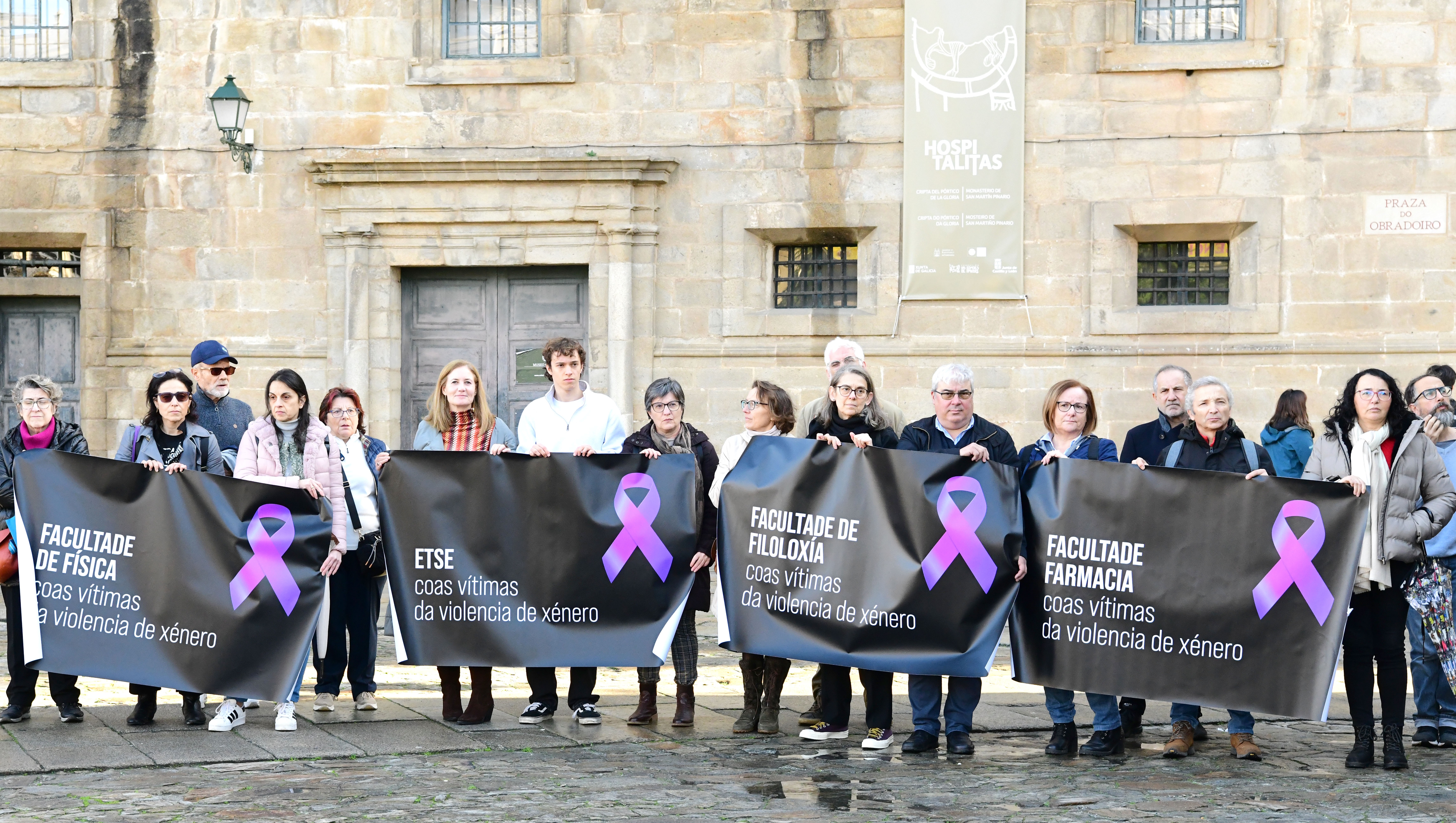Representantes do equipo de goberno, da comunidade universitaria dos centros docentes e do Consello do Estudantado da USC gardaron hoxe un minuto de silencio en recordo das vítimas de violencia de xénero e en rexeitamento da violencia contra as mulleres neste 25N. O acto en Santiago tivo lugar na Praza do Obradoiro coa presenza do reitor Antonio López e parte do equipo reitoral, mentres que en Lugo foi no Edificio Intercentros coa participación do vicerreitor de Organización Académica e Campus de Lugo, Francisco Fraga, e da delegada do reitor para a Igualdade, Sonia Esperanza Rodríguez Boente.