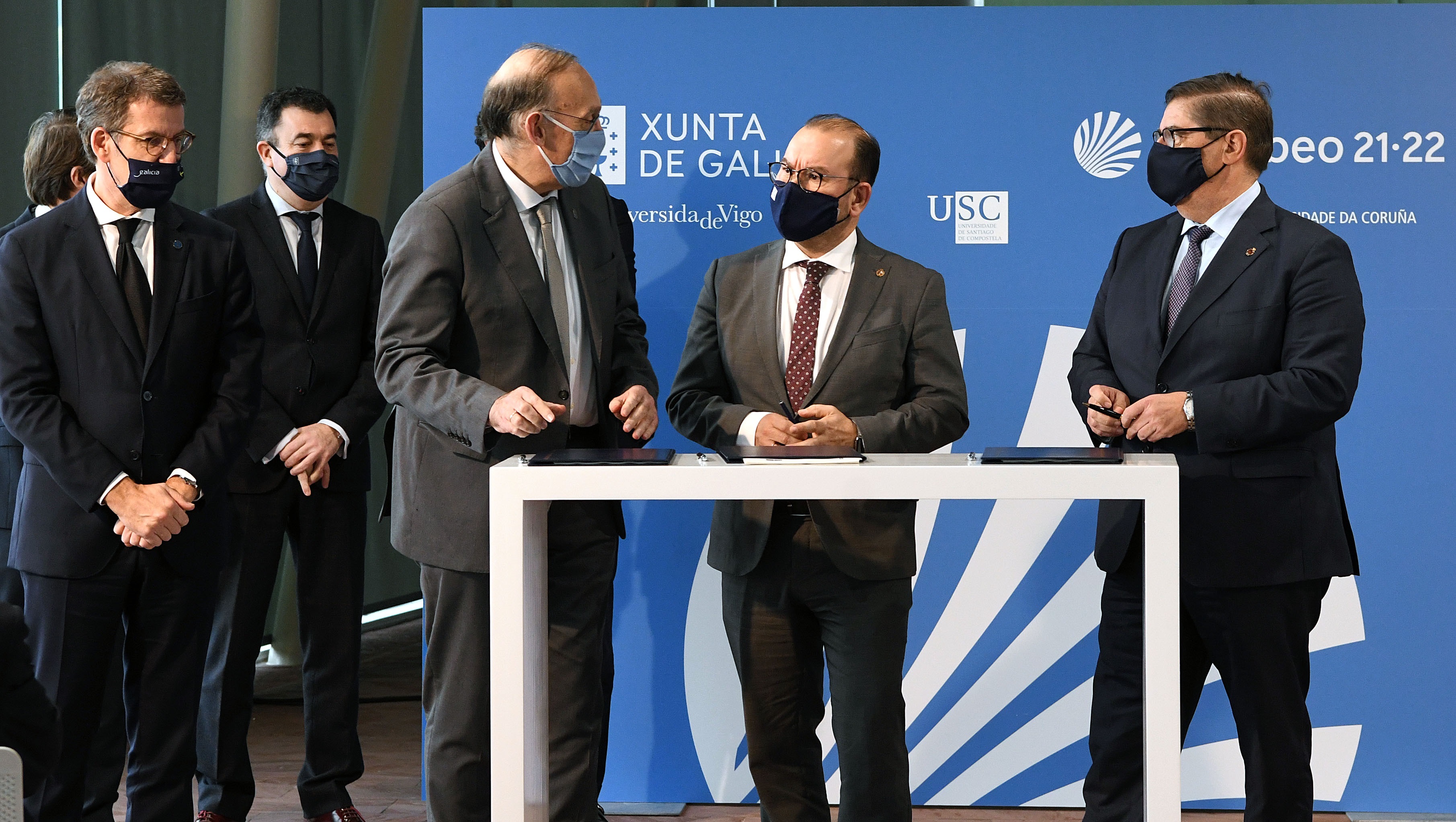 Os reitores das tres universidades galegas e o presidente da Xunta de Galicia, Alberto Núñez Feijóo, rubricaron este venres 18 o Plan Galego de Financiamento Universitario que se estenderá entre 2022 e 2026. “É positivo que manteñamos a continuidade de plans de financiamento quinquenais para o Sistema Universitario de Galicia”, afirmou o reitor da USC, Antonio López, quen tamén se amosou satisfeito polo feito de que se contemple un plan complementario de infraestruturas. Que se habiliten os fondos de investigación “dun xeito máis estrutural para atender ás novas necesidades” foi outra das cuestións subliñadas por Antonio López. Tamén tomaron parte no acto os reitores da UVigo, Manuel Joaquín Reigosa, e da UDC, Julio Abalde. O plan mobilizará máis de 3.200 millóns de euros no vindeiro quinquenio.