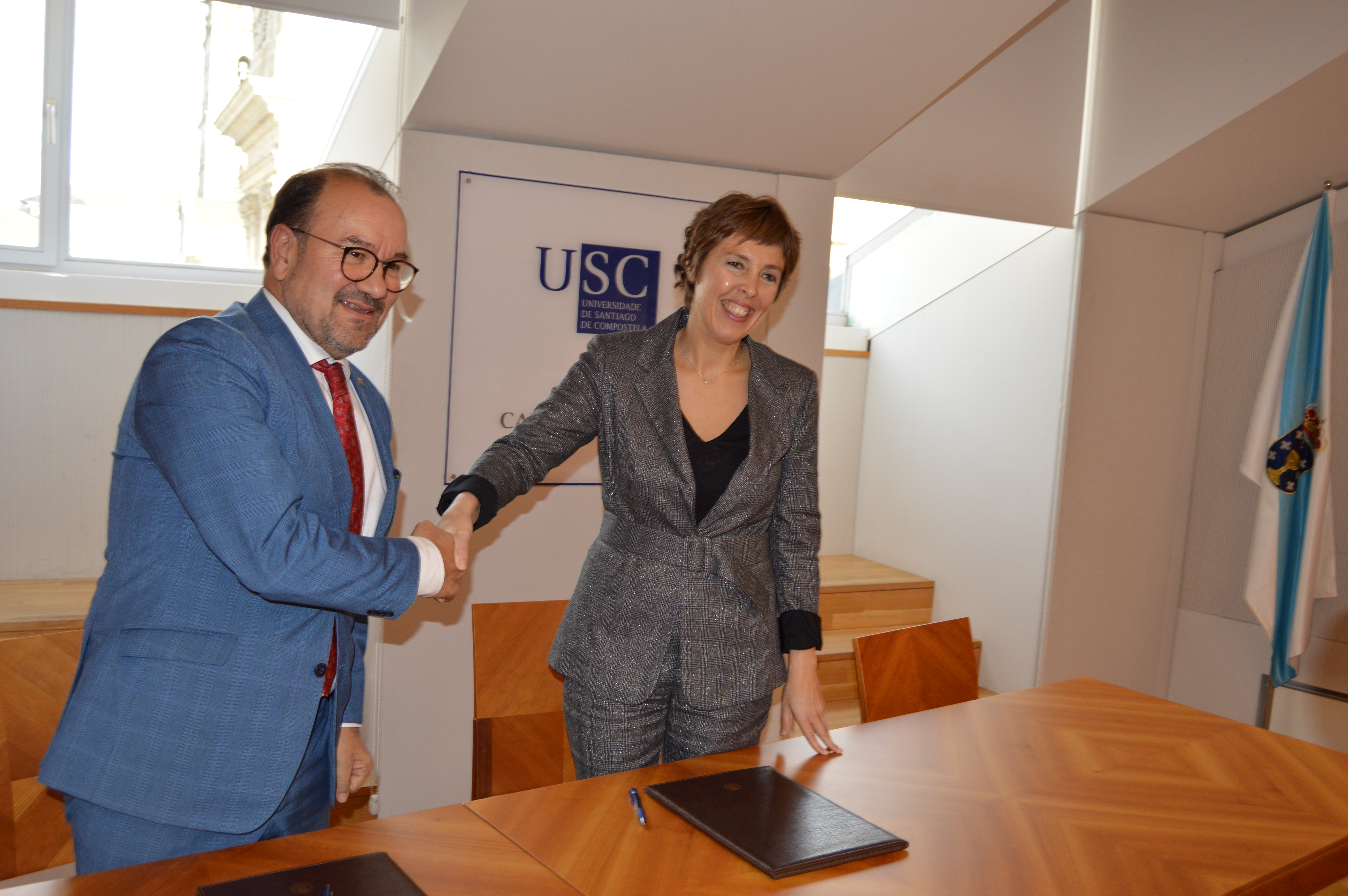 O reitor Antonio López e a adxunta á Presidencia do grupo Aresa, Carlota López, asinan o convenio para a edición da nova edición dun galardón orientado a distinguir iniciativas a prol do medio rural que axuden a mellorar a calidade de vida dos seus habitantes. O prazo de presentación de candidaturas permanece aberto ata o 13 de xaneiro de 2023 nos rexistros de que dispón a USC nos campus de Lugo e Santiago