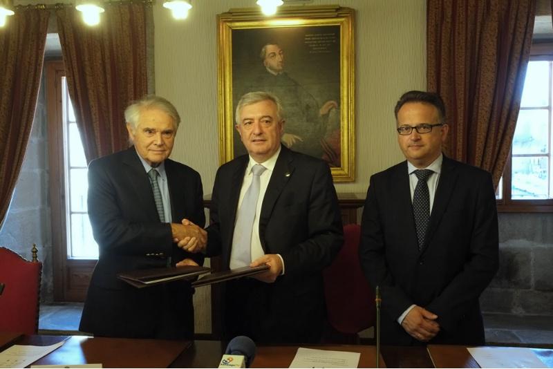 O Premio Aresa de Desenvolvemento Rural inicia a súa décimo sexta edición logo da sinatura protocolaria este mércores do convenio de colaboración entre a USC e o Grupo Aresa, promotores desta iniciativa que recoñece aquelas iniciativas que contribúen á mellor do medio rural, promovidas por entidades, empresas, grupos de investigación ou persoas que compartan o interese polo progreso e a innovación do sector primario e o traballo neste ámbito. Asinaron o convenio o reitor da USC, Juan Viaño, e o presidente do Grupo Aresa, Álvaro Rodríguez Eiras, nun acto no Colexio de San Xerome ao que tamén asistiu o vicerreitor de Coordinación do Campus de Lugo, Javier Bueno Lema. As bases presentaranse oficialmente en Lugo no mes de setembro, momento no que se abrirá o prazo de recepción das candidaturas. A USC e Aresa veñen apoiando este galardón dende o ano 2000, data da primeira convocatoria do Premio. No palmarés do Premio, un dos mellor dotados do seu ámbito, figuran o profesor Javier Guitián, a Aula de Produtos Lácteos ou a Facultade de Veterinaria, dentro do eido universitario; personalidades coma Xosé Manuel Rodríguez Silva, ex-director xeral de Agricultura da Comisión Europea; firmas coma Ingapan, Casa Macán, Champivil ou Alibós; consellos reguladores de denominacións de orixe e de indicacións xeográficas protexidas como a IXP Ternera Gallega e as DO Ribeira Sacra e Queixo San Simón da Costa; e modelos de asociacionismo, como a Asociación Nacional de Criadores de Gando Vacún Selecto de Raza Rubia Galega ou a SAT Montes de Trabada, entre outros. Moitos dos distinguidos teñen en común a xeración de riqueza e emprego na agricultura e na gandería, unha prioridade nos tempos que corren, tal como sinalou o presidente de Aresa, “a idea da que parte este premio está máis de actualidade que nunca, xa que 2015 foi declarado Ano Internacional dos Solos para chamar a atención sobre a súa saúde, o seu manexo e a súa fertilización eficiente, en aras dunha maior produtividade”. Neste sentido, Eiras apuntou a necesidade de ofrecer solucións tecnolóxicas e industriais para optimizar o rendemento do agro e, en consecuencia, favorecer o benestar da poboación do rural, aspecto que constitúe un piar para o Grupo e que se valorará especialmente nas propostas. En opinión de Juan Viaño, este premio constitúe “un bo exemplo de colaboración entre empresa e universidade, compromiso que xa acada os dezaseis anos de convocatorias consecutivas”. A súa traxectoria “superou as expectativas dos seus promotores en canto ao seu asentamento e recoñecemento pola sociedade galega, alcanzando grande importancia tanto polos currículos dos premiados como pola súa dotación” económica”.