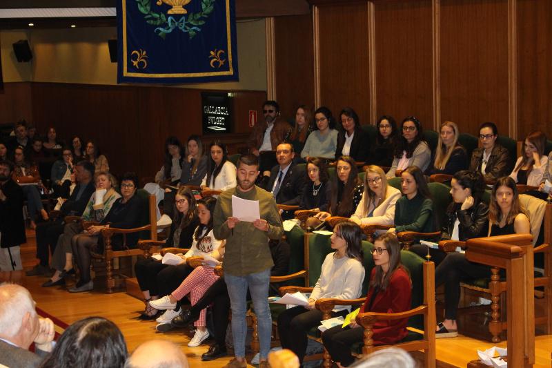 Lectura de poemas por parte do alumnado. Foto: Paula Martínez Graña Acto das Letras Galegas adicado a María Victoria Moreno. Foto: Paula Martínez Graña Acto das Letras Galegas 2018 no Salón Nobre de Fonseca. Foto: Paula Martínez Graña