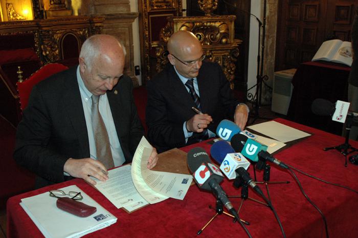 Juan Casares e Anxo Queiruga, no momento da sinatura en Salón de Graos de San Xerome. Foto Alfonso-Servimav USC