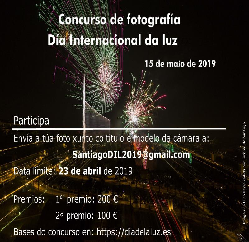 Neste contexto, xa abriu o prazo de recepción de traballos un concurso fotográfico cuxo prazo de presentación se estenderá ata o día 23 de abril. O obxectivo desta convocatoria é celebrar este evento destacando as imaxes máis interesantes e de calidade relacionadas con algún fenómeno óptico. A fotografía debe ser enviada ao enderezo de correo electrónico SantiagoDIL2019 [at] gmail.com (SantiagoDIL2019[at]gmail[dot]com), xunto co nome do participante, un título do traballo e modelo de cámara coa que se obtivo.