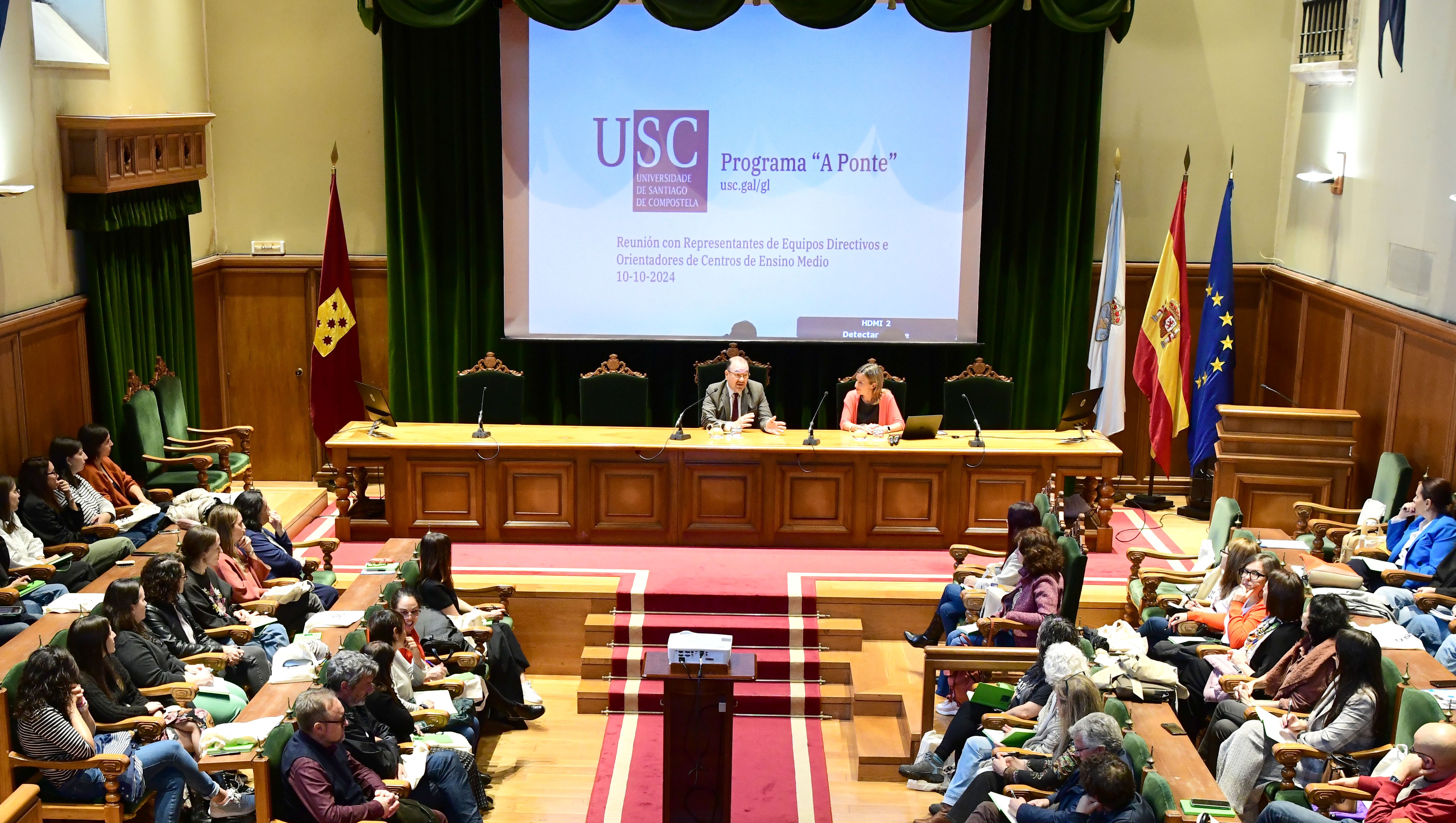 “Continuar a estreitar a comunicación entre a Universidade compostelá e os centros de ensino medio”. Así definía este xoves o reitor compostelán, Antonio López, o propósito da xuntanza que, un ano máis, mantivo co persoal directivo e equipos de orientación de centros de ensino medio da contorna acompañado da delegada do reitor para o Ensino Medio e Coordinadora do Programa A Ponte, Maite Flores.