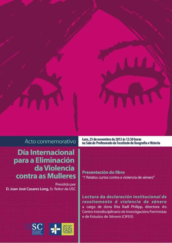 A Universidade de Santiago de Compostela súmase este luns 25 á conmemoración do Día Internacional para a Eliminación da Violencia contra as Mulleres cun acto que presidirá o reitor Juan Casares. Será ás 12.30 horas na Sala de Profesorado da Facultade de Xeografía e Historia cando se presente o libro 7 Relatos curtos contra a violencia de xénero e a directora do Centro Interdisciplinario de Investigacións Feministas e de Estudos de Xénero (CIFEX), Rita Radl Philipp, dea lectura a unha declaración institucional de rexeitamento á violencia de xénero. Participarán tamén no acto o decano da Facultade de Xeografía e Historia, Juan Monterroso; o director do Servizo de Publicacións e Intercambio Científico, Juan L. Blanco Valdés; a secretaria xeral da Igualdade da Xunta de Galicia, Susana López Abella; a vicerreitora de Responsabilidade Social e Calidade, Benita Silva Hermo; e a coordinadora da Oficina de Igualdade de Xénero, Eva Aguayo Lorenzo.
