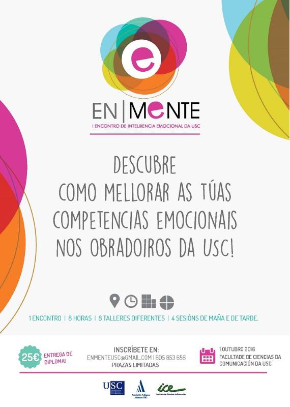 O programa Enmente prolongarase durante unha xornada de oito horas e está estruturado en oito obradoiros dinámicos e de participación, a través dos que se pretende axudar a maximizar o potencial das persoas asistentes, e en particular as persoas do ámbito universitario. Para acadar este obxectivo, os promotores deste primeiro encontro de intelixencia emocional, poñerán ao alcance das persoas asistentes ferramentas e estratexias, a través de unha metodoloxía eminentemente práctica. O equipo docente do programa Enmente está formado por 8 persoas relatoras procedentes de diferentes ámbitos profesionais e especialidades. Trátase de profesionais de recoñecido prestixio na nosa comunidade e tamén a nivel nacional, profesorado que provén do entorno universitario e tamén formadores procedentes da empresa privada. Todos os relatores convidados a participar neste encontro destacan en eidos relacionados coa Educación, os Recursos Humanos, a Innovación e Talento, Coaching, Psicoloxía, Intelixencia Emocional, PNL –Programación Neurolinguística- etc. As distintas actividades formativas programadas permitirán ao público participante traballar estratexias e ferramentas para a xestión emocional a través de diferentes obradoiros. A temática destas sesións, de carácter dinámico e interactivo, é ampla é diversa. Así, Jon Berastegui impartirá un obradoiro de xestión do estres e ansiedade, mentres que Alejandra Mosteiro guiará outro sobre xestión de conflitos para traballar a asertividade. A mellora da comunicación verbal e non verbal centrará a acción dirixida por Aixa Permuy e María José Méndez Lois, mentres que Carmen Vázquez de Prada afondará en cuestións relativas á escoita activa e empatía, e Manuel Rivero abordará algunhas estratexias para a toma de decisións. No marco do programa Enmente, tamén se traballarán técnicas para favorecer o noso benestar nun obradoiro que correrá a cargo da madrileña Silvia Escribano, e para traballar a nosa motivación e autoestima (Marcela Parga) ou a tolerancia á frustración para saír reforzado de situacións difíciles (Raquel Pedrouso). Desenvolvemento do programa e inscrición Os oito obradoiros incluídos neste primeiro Encontro de Intelixencia Emocional desenvolveranse o día 1 de outubro, en quenda de mañá e tarde (de 9.00 a 13.00 e de 15.00 a 19.00 horas) na Facultade de Ciencias da Comunicación de Santiago. As persoas interesadas en participar nestes obradoiros, que están encamiñados a favorecer o desenvolvemento persoal e profesional a través da mellora das nosas competencias emocionais, para ser capaces de enfrontarnos aos nosos retos e obxectivos dun xeito máis solvente e eficaz, só poderán escoller catro das actividades ofertadas. A inscrición nesta xornada está aberta e ten un custe de 25 euros. As prazas son limitadas e as persoas interesadas poden reservar praza, formalizar a inscrición e ampliar información na web www.antigosalumnos.usc.es, así como a través do número de teléfono 605 853 565 ou no enderezo de correo electrónico enmenteusc [at] gmail.com (enmenteusc[at]gmail[dot]com).