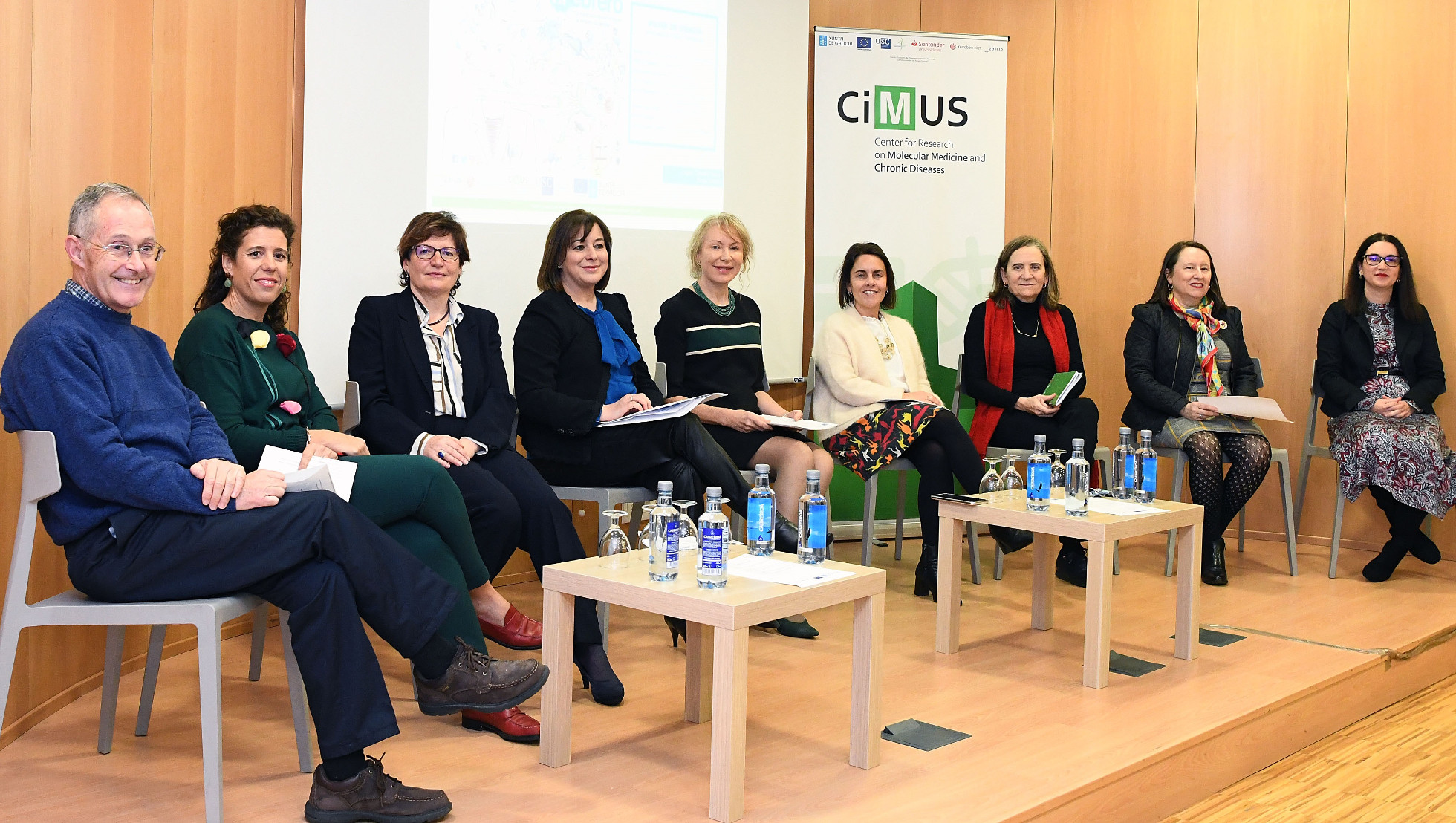 O Centro de Investigación en Medicina Molecular e Enfermidades Crónicas (CiMUS) acolleu, pola súa banda, a mesa redonda ‘Muller de ciencia’, na que as investigadoras e profesoras da USC Mabel Loza e María José Alonso; a xestora do Centro, Ruth González; a presidenta da Agrupación industrial de Saúde de Galicia, Rocío Mosquera; a representante de Executivas de Galicia, Sara Campos; e o catedrático da USC, Anxo Carracedo, reuníronse para debater sobre o desenvolvemento da carreira científica con perspectiva de xénero. Ao acto tamén quixeron sumarse a secretaria xeral de Igualdade da Xunta, Susana López Abella, e a directora da Axencia Galega de Innovación, Patricia Argerey. Experiencias persoais no desenvolvemento profesional, anécdotas e pluralidade foron os eixos que centraron as exposicións das investigadoras e tecnólogas.