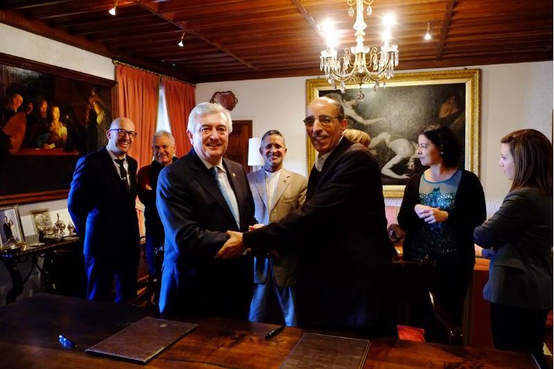 O reitor Juan Viaño e o seu homólogo da Universidade de Tifariti de Sáhara Occidental, Jatari Hamudi, asinaron este mércores un protocolo de cooperación cultural, científica e pedagóxica entre ambas institucións académicas. O obxectivo principal é promover o desenvolvemento e difusión da cultura e, en especial, do ensino superior de grao e posgrao e a investigación científica e tecnolóxica.
