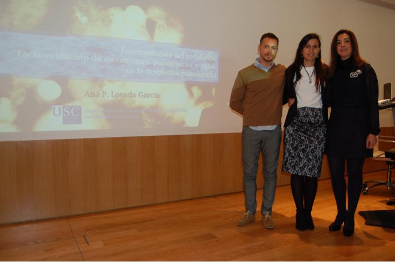 A investigación feita por Losada García baixo a dirección dos profesores dos departamentos de Ciencias Clínicas Veterinarias e de Anatomía Patolóxica da Universidade de Santiago de Compostela, María Isabel Quiroga Berdeal e Roberto Bermúdez Pose, respectivamente, constitúe un importante avance no coñecemento da enteromixose do rodaballo. A tese senta as bases para o diagnóstico clínico e histopatolóxico desta doenza de orixe parasitario, aporta novos datos respecto dos mecanismos que provocan graves danos na mucosa gastrointestinal dos peixes afectados e demostra que é a propia resposta inmunitaria do rodaballo a que participa no desenvolvemento dunha enfermidade que é unha ameaza para a súa produción. Os resultados acadados por Losada García na súa investigación abren novas expectativas cara o futuro plantexamento de novos estudos encamiñados a previr e controlar a enteromixose, unha parasitose que provoca o adelgazamento moi marcado dos exemplares afectados e que pode ter consecuencias devastadoras, xa que causa a morte do 100% dos peixes enfermos. Este estudo sobre a enteromixose do rodaballo, na actualidade un dos problemas patolóxicos máis graves e de maior relevancia que afecta á especie, encádrase dentro dos numerosos traballos xa desenvolvidos polo grupo de Anatomía Patolóxica da Facultade de Veterinaria de Lugo nos últimos 15 anos, período no que se fixeron moitas investigacións centradas no estudo das enfermidades do rodaballo que aínda constituían unha ameaza para a súa produción, a fin de dar así resposta aos problemas derivados da “domesticación” da especie. O crecente interese da comunidade científica pola piscicultura mariña vén dado pola crecemento experimentado por esta actividade produtiva nos últimos anos, tempo non que a acuicultura mariña se ten convertido na produción gandeira con maior proxección de futuro. Doutra banda, a acuicultura supón tamén unha alternativa necesaria para satisfacer a demanda de peixe e representa un importante motor de desenvolvemento nas zonas costeiras altamente dependentes da pesca. Na actual conxuntura na que se atopa a acuicultura mariña, Galicia ten un cometido destacado, pois é a comunidade autónoma española líder na cría intensiva de rodaballo e acapara un 99% da súa produción no plano nacional. O éxito do seu cultivo débese, en grande medida, ao profundo coñecemento científico e tecnolóxico desenvolvido nas dúas últimas décadas e para que foi primordial a estreita colaboración entre empresas, investigadores e Administración. Tribunal da tese O tribunal responsable de avaliar a tese de doutoramento presentada por Ana Paula Losada García, quen opta á Mención Europea do título de doutor, estivo formado por cinco expertos/as de recoñecido prestixio no ámbito da ictiopatoloxía.