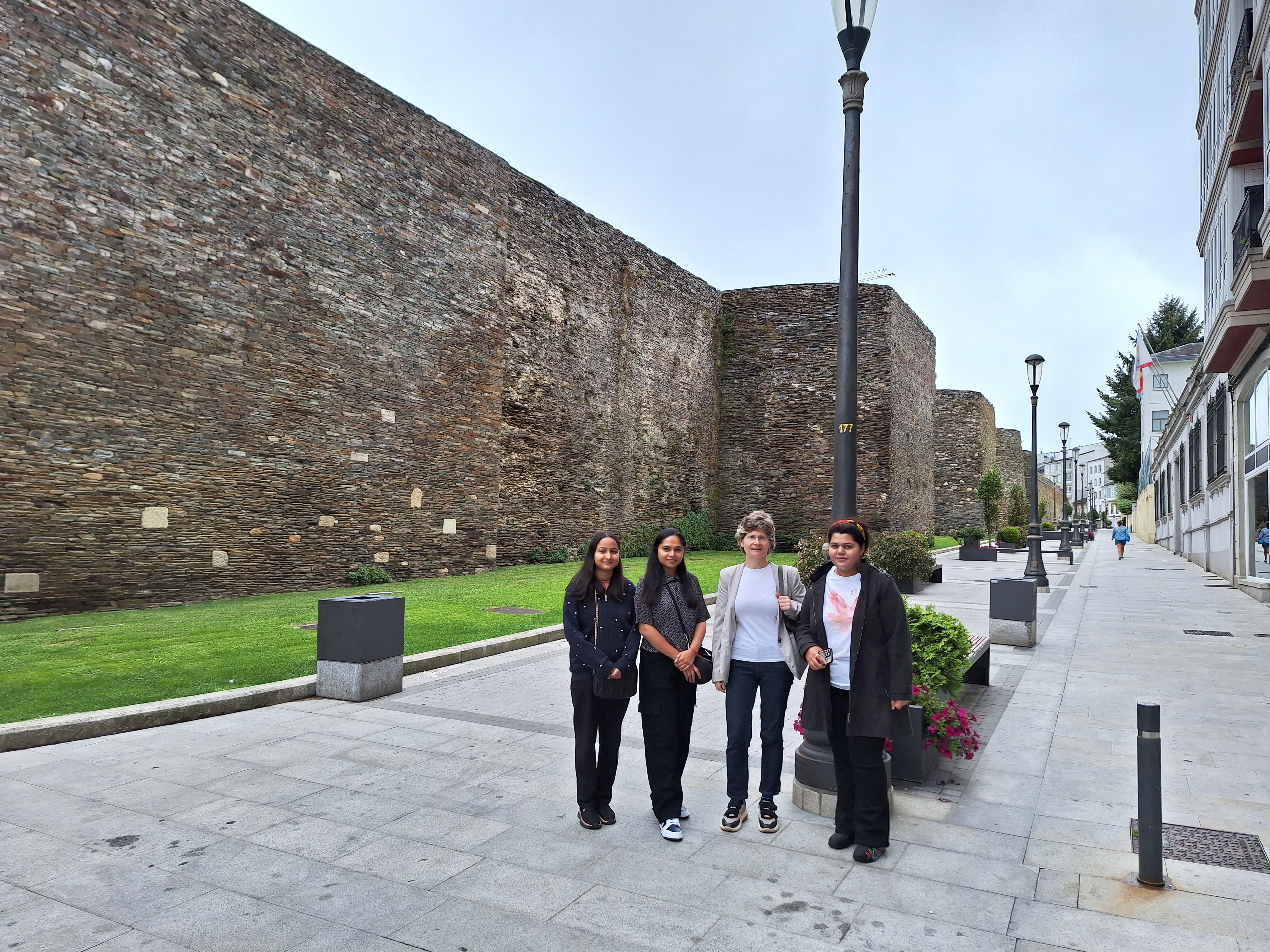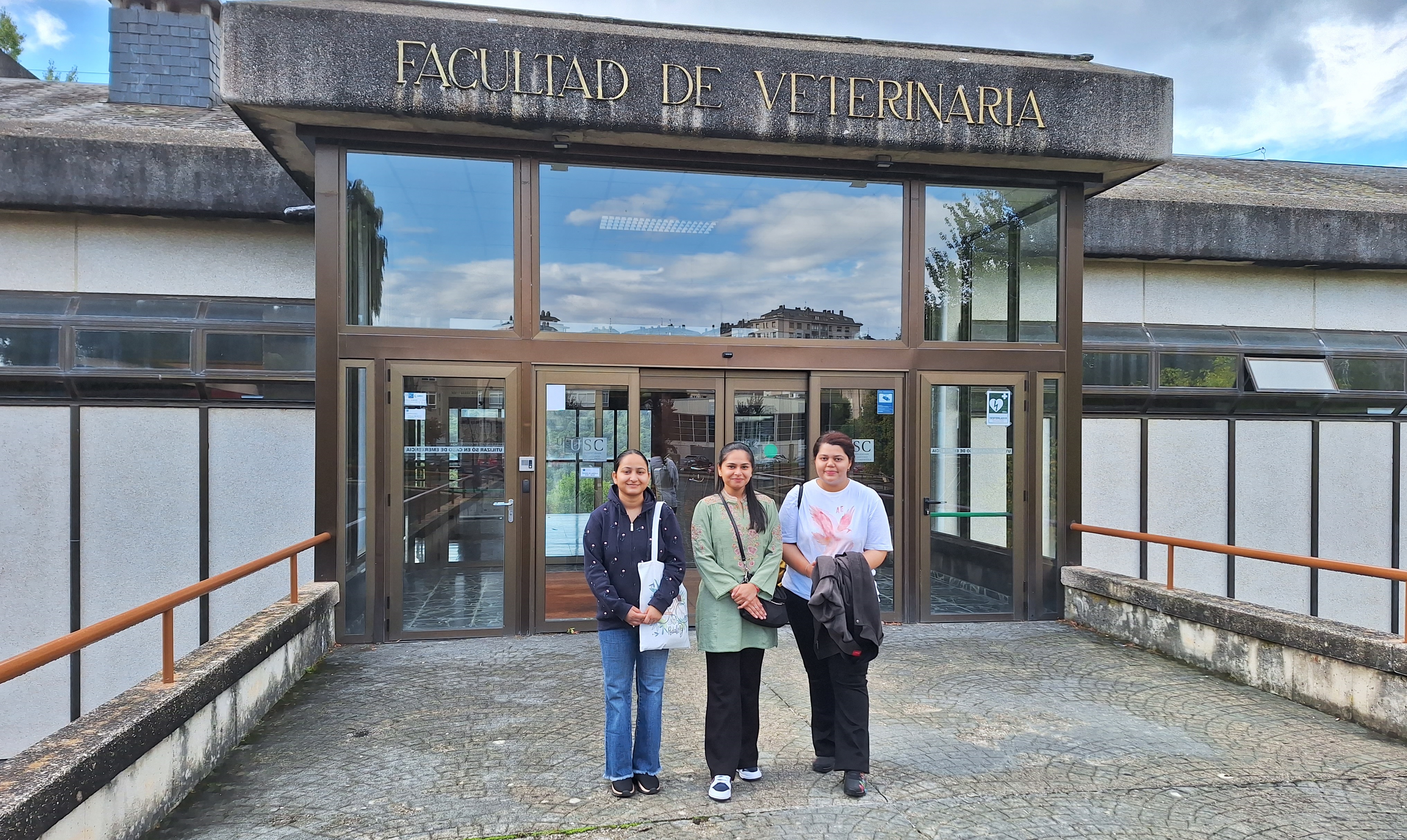 Mahima, Nandini e Anjali, diante da Facultade de Veterinaria da USC