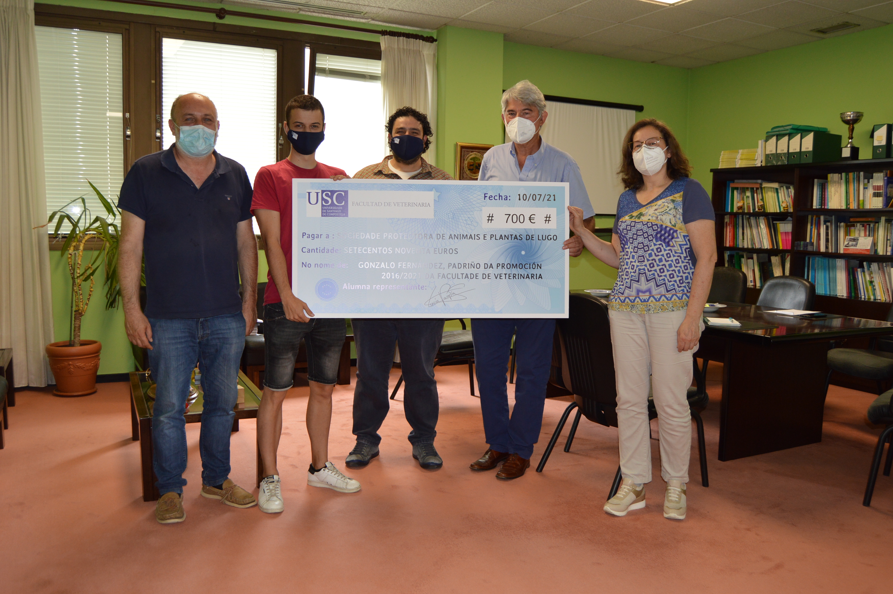 O decano da Facultade de Veterinaria, Gonzalo Fernández, acompañado de Adrián Gonzalo Pinedo, en calidade de representante do alumnado da promoción 2016-2021, formalizaron este martes a entrega dun cheque por importe de 700 euros ao presidente da Protectora de Lugo, Juan Alberto Losada, no marco dun acto no que tamén estiveron presentes Elena Guinarte e Pablo Díaz, como directivos da sociedade luguesa.