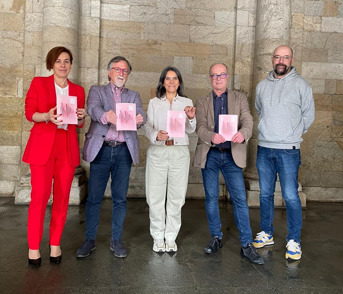 A vicerreitora de estudantes e cultura da USC, Pilar Murias; a concelleira de Acción Cultural en funcións, Mercedes Rosón; o deputado provincial en funcións, Xurxo Couto; o director do Centro Galego de Arte Contemporánea (CGAC), Santiago Olmo xunto ao director-xerente do Auditorio de Galicia, Xaquín López, presentaron unha nova edición destas Xornadas baixo o título 'A voz a escena'. O programa completo pode consultarse nesta ligazón.