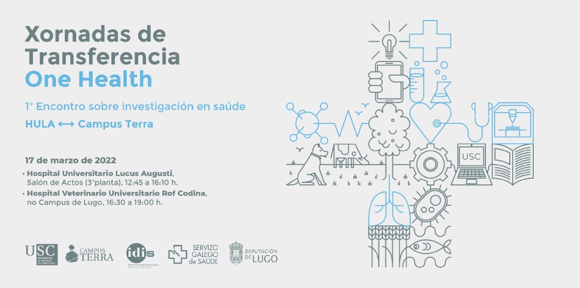 O Campus Terra da USC e o Hospital Universitario Lucus Augusti (HULA) celebrarán o vindeiro xoves 17 de marzo, a partir das 12.45 horas, as Xornadas de Transferencia One Health, un progrma no marco do que investigadores da sede universitaria luguesa e do Sergas analizarán casos de éxito de actuacións xa desenvolvidas de forma conxunta ou con colaboracións entre profesionais do Sergas e da USC, ao tempo que coñecerán os equipamentos, investigadores e recursos científicos de que dispón cada entidade, a fin de avaliar así futuras liñas de investigación e de transferencia de I+d+i conxuntas.