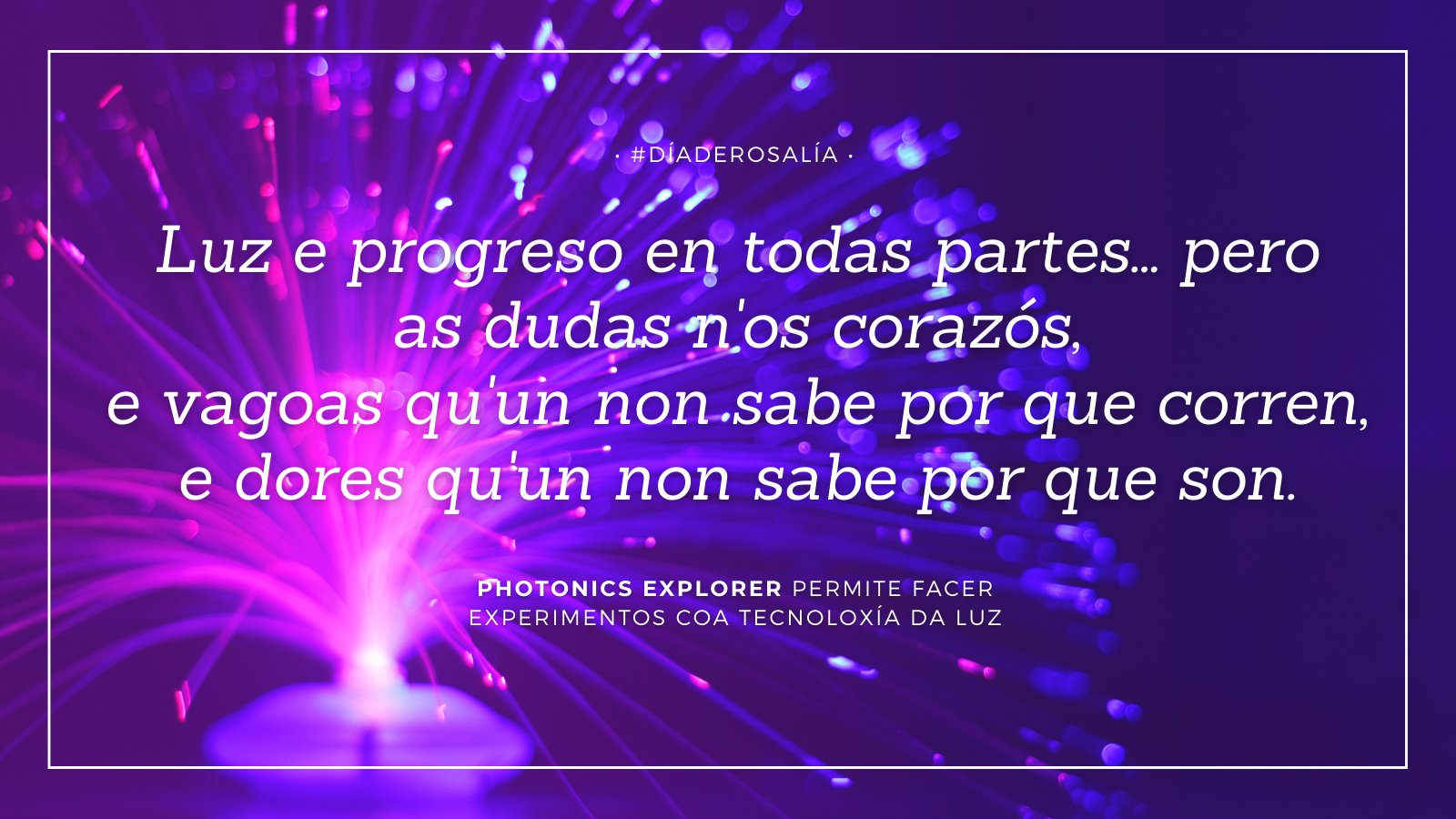 O grupo de innovación docente XuvenCiencia do Campus de Lugo da USC súmase á celebración do Día de Rosalía de Castro coa difusión, a traves das súas redes sociais en Twitter, Instagram e Facebook e da súa páxina web, dunha serie de contidos multimedia nos que se poñen en relación algúns dos versos máis coñecidos dos poemas en galego de Rosalía de Castro cos sete kits de experimentación científica para as aulas de secundaria deseñados e desenvolvidos polos integrantes de XuvenCiencia.